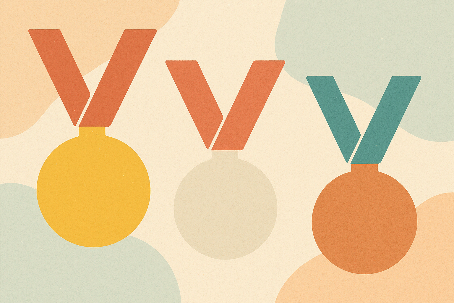 Illustration vectorielle minimaliste avec trois médailles stylisées en jaune, bleu et orange, accompagnées d’étoiles, de formes abstraites et de confettis. Palette pastel douce sur fond crème, ambiance festive et professionnelle. Composition centrée en bas de l’image, laissant un grand espace vide pour le texte ou le message.