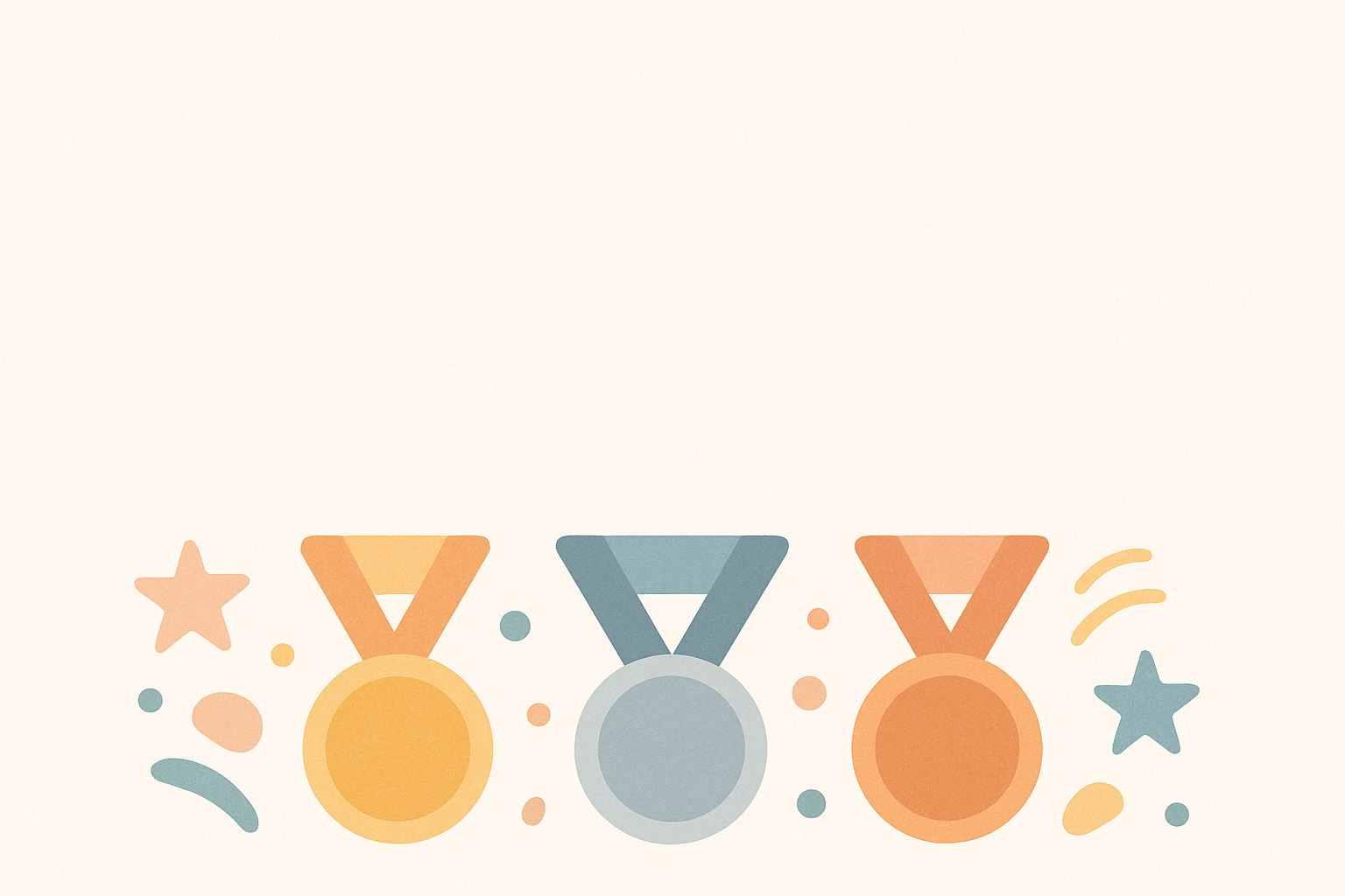 Illustration vectorielle minimaliste avec trois médailles stylisées en jaune, bleu et orange, accompagnées d’étoiles, de formes abstraites et de confettis. Palette pastel douce sur fond crème, ambiance festive et professionnelle. Composition centrée en bas de l’image, laissant un grand espace vide pour le texte ou le message.