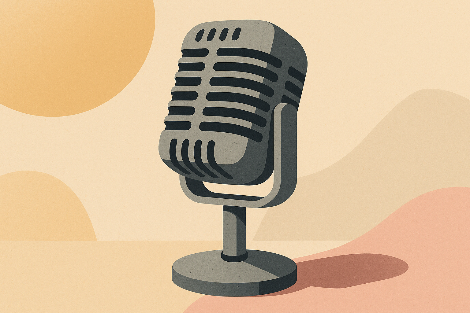 Illustration vectorielle d’un micro vintage gris sur fond beige clair, avec des éléments abstraits en bas de l’image : notes de musique, saxophone, étoiles, formes ondulées et symboles en tons doux (ocre, vert olive, orange, beige). Style rétro minimaliste avec palette pastel chaude, ambiance musicale et artistique idéale pour communication visuelle professionnelle.