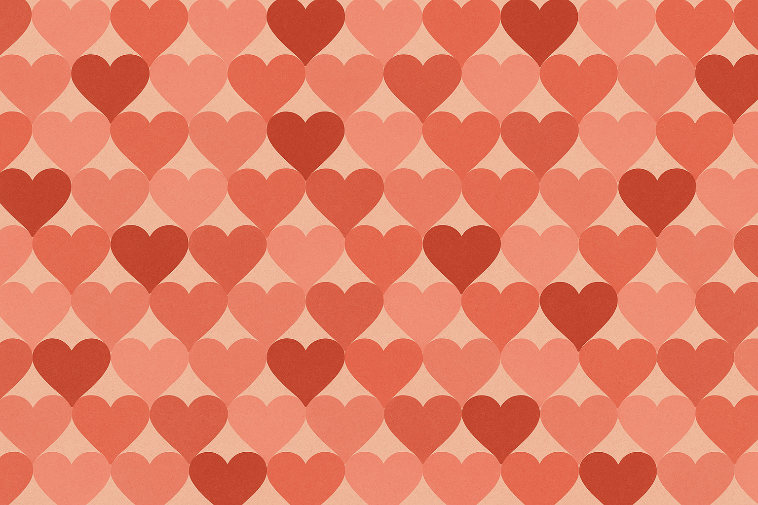 Motif répétitif de cœurs rouges et roses en dégradé sur fond crème, avec une disposition régulière en bas de l’image laissant un grand espace vide en haut. Style minimaliste et chaleureux, couleurs douces dans les tons rouges, rosés et saumon. Idéal pour recherches incluant : cœurs, fond pastel, design affectif, visuel romantique, carte postale élégante.