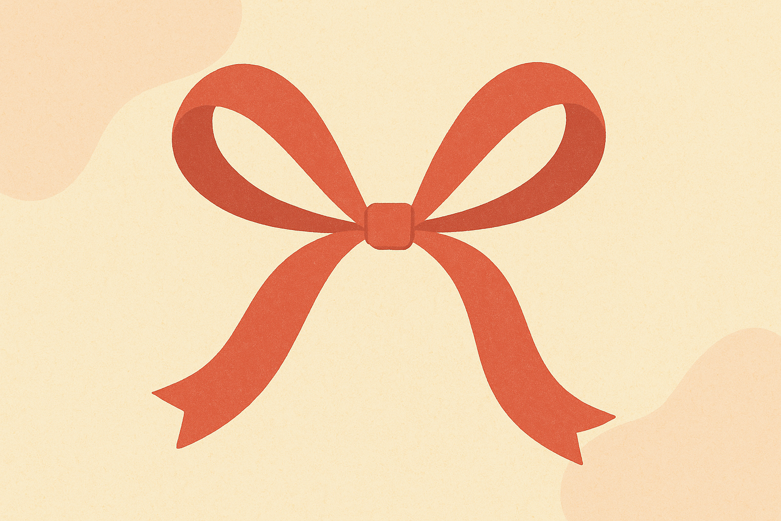 Illustration minimaliste avec un grand nœud rouge orangé au centre inférieur sur fond beige uni. Le ruban est stylisé avec des courbes douces et des ombres subtiles, créant un effet de volume. Le style est épuré, avec une palette pastel et une composition centrée, idéale pour un usage professionnel élégant.