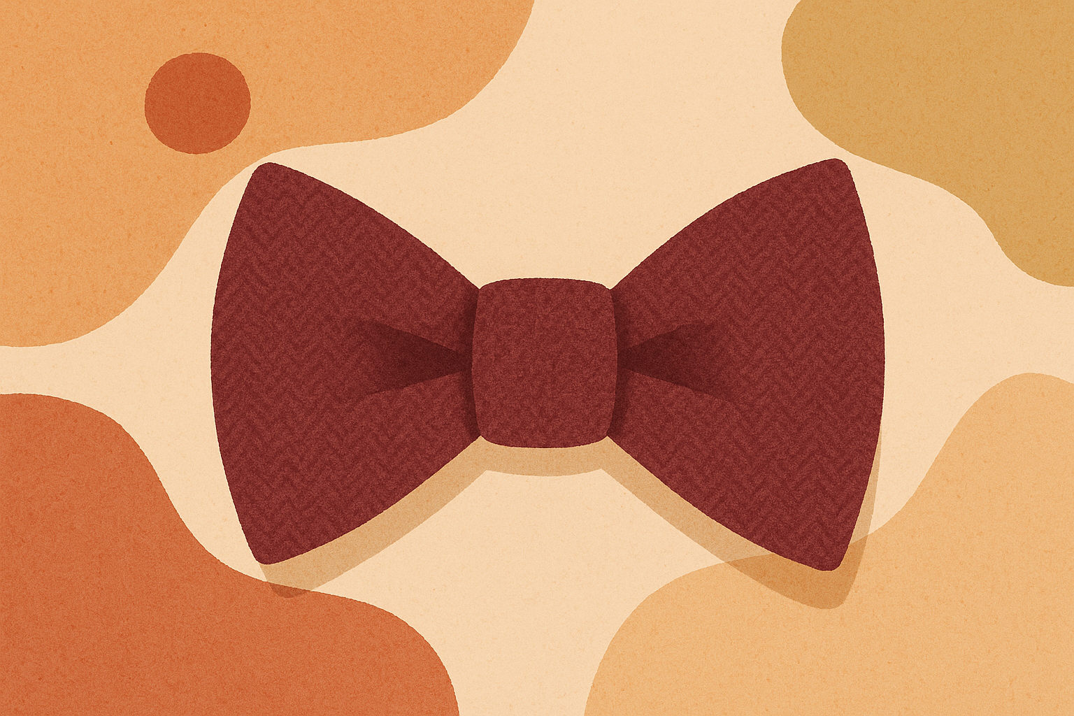 Illustration minimaliste sur fond crème avec un grand nœud papillon brun au centre, entouré de motifs géométriques et floraux en tons chauds (bordeaux, ocre, beige). Formes simples comme fleurs, feuilles, losanges, demi-cercles et damiers. Style rétro texturé avec palette automnale, ambiance élégante et professionnelle.