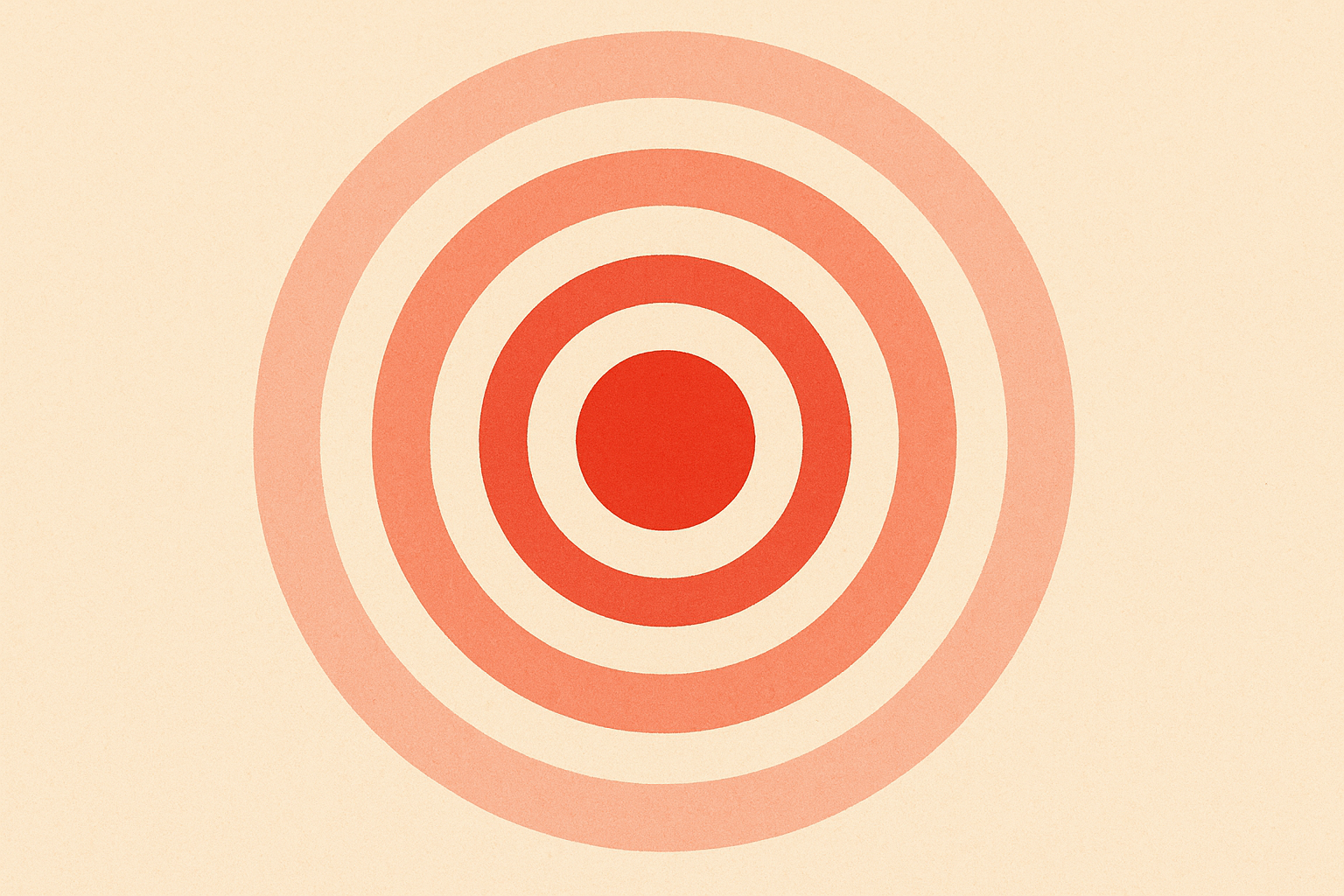 Illustration minimaliste avec une grande cible rouge centrée sur fond beige, entourée d’éléments de bureau stylisés : tasse rouge, post-its jaunes et orange, carnet ouvert, sablier, crayon, icône d’alerte, plante verte en pot. Couleurs chaudes et douces (rouge, orange, vert, beige), style plat et épuré, ambiance professionnelle et organisée.
