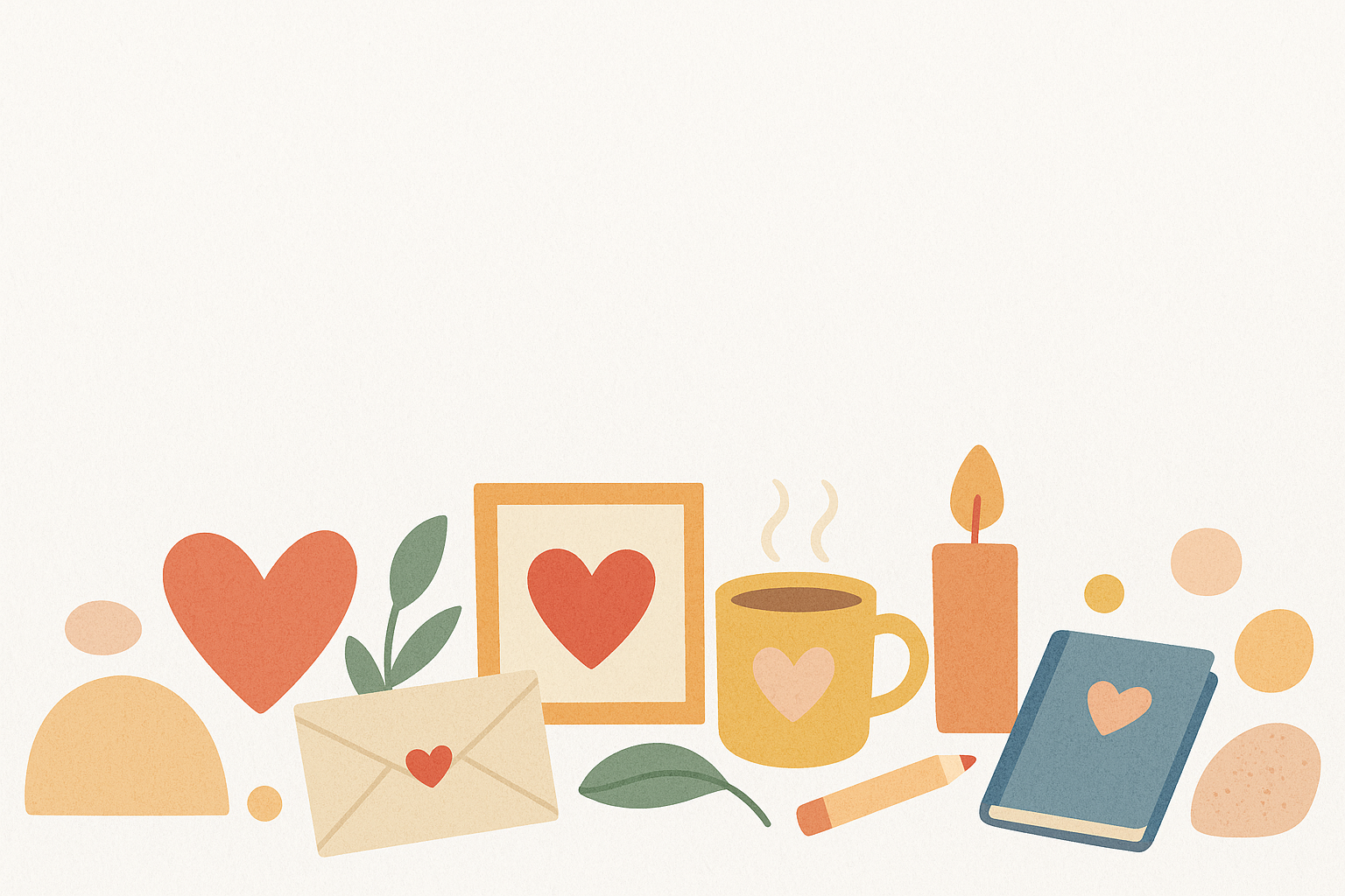 Illustration minimaliste aux tons pastel doux (ocre, terracotta, vert sauge, bleu ardoise) représentant des objets chaleureux : tasse fumante, bougie, enveloppe, carnet, cœur, cadre, feuilles. Style épuré et convivial, parfait pour des cartes postales de communication professionnelle avec une touche humaine.