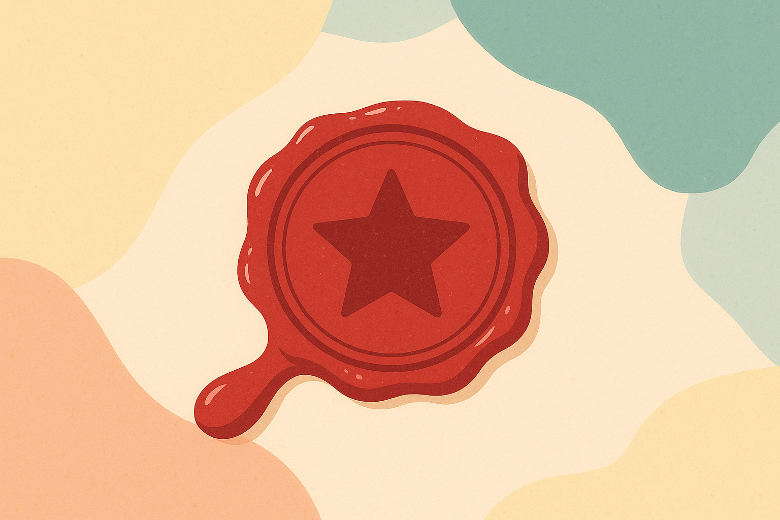 Illustration en style flat design avec des tons pastel doux (beige, orange, vert sauge, bleu doux). Éléments visuels : bougie allumée, vase avec plante, étoile, cachet de cire rouge, livre ouvert, tasse de café, formes abstraites, cœur, lune et étoiles. Composition centrée en bas avec espace vide en haut pour le texte, ambiance calme et inspirante adaptée à la communication professionnelle.