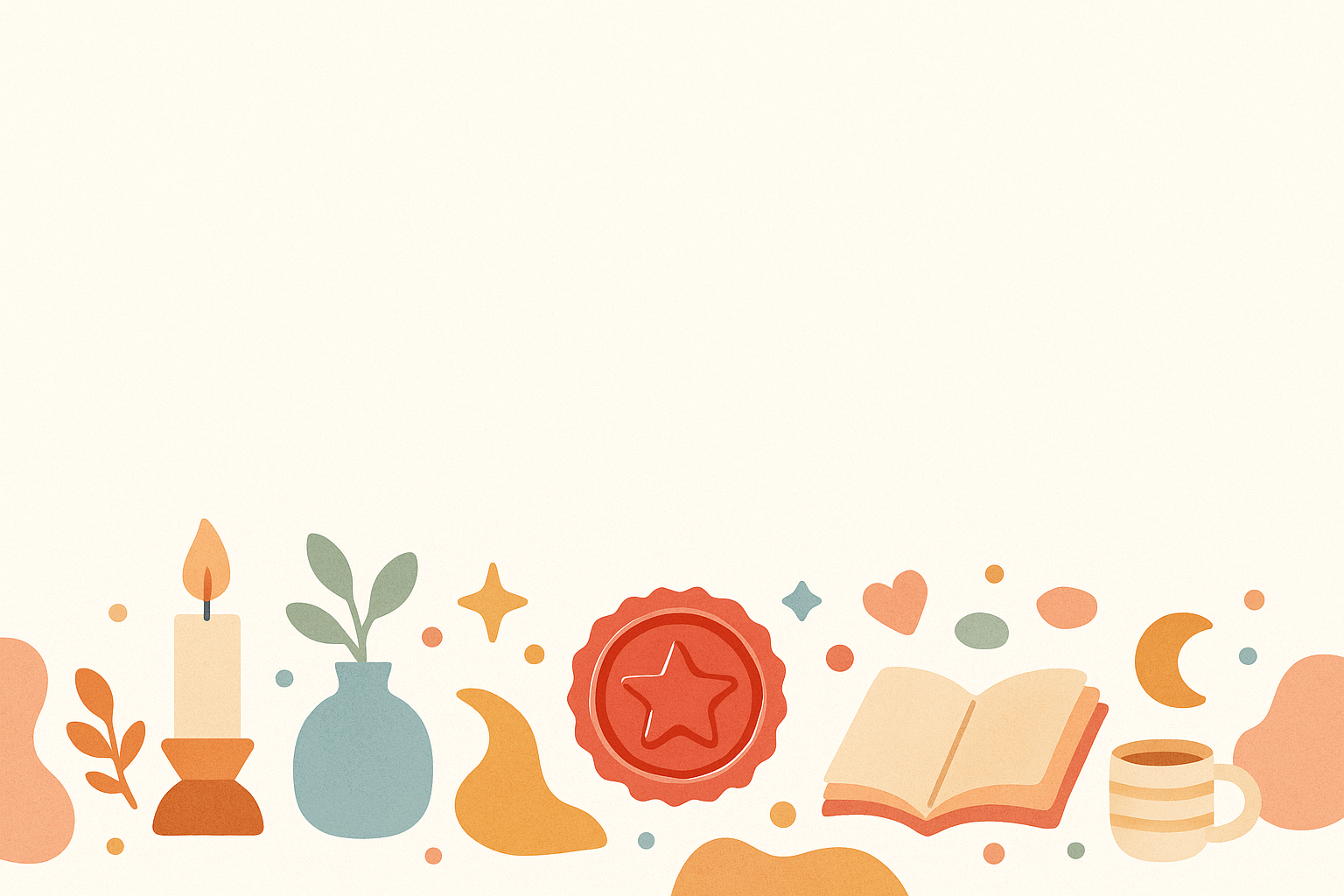 Illustration en style flat design avec des tons pastel doux (beige, orange, vert sauge, bleu doux). Éléments visuels : bougie allumée, vase avec plante, étoile, cachet de cire rouge, livre ouvert, tasse de café, formes abstraites, cœur, lune et étoiles. Composition centrée en bas avec espace vide en haut pour le texte, ambiance calme et inspirante adaptée à la communication professionnelle.