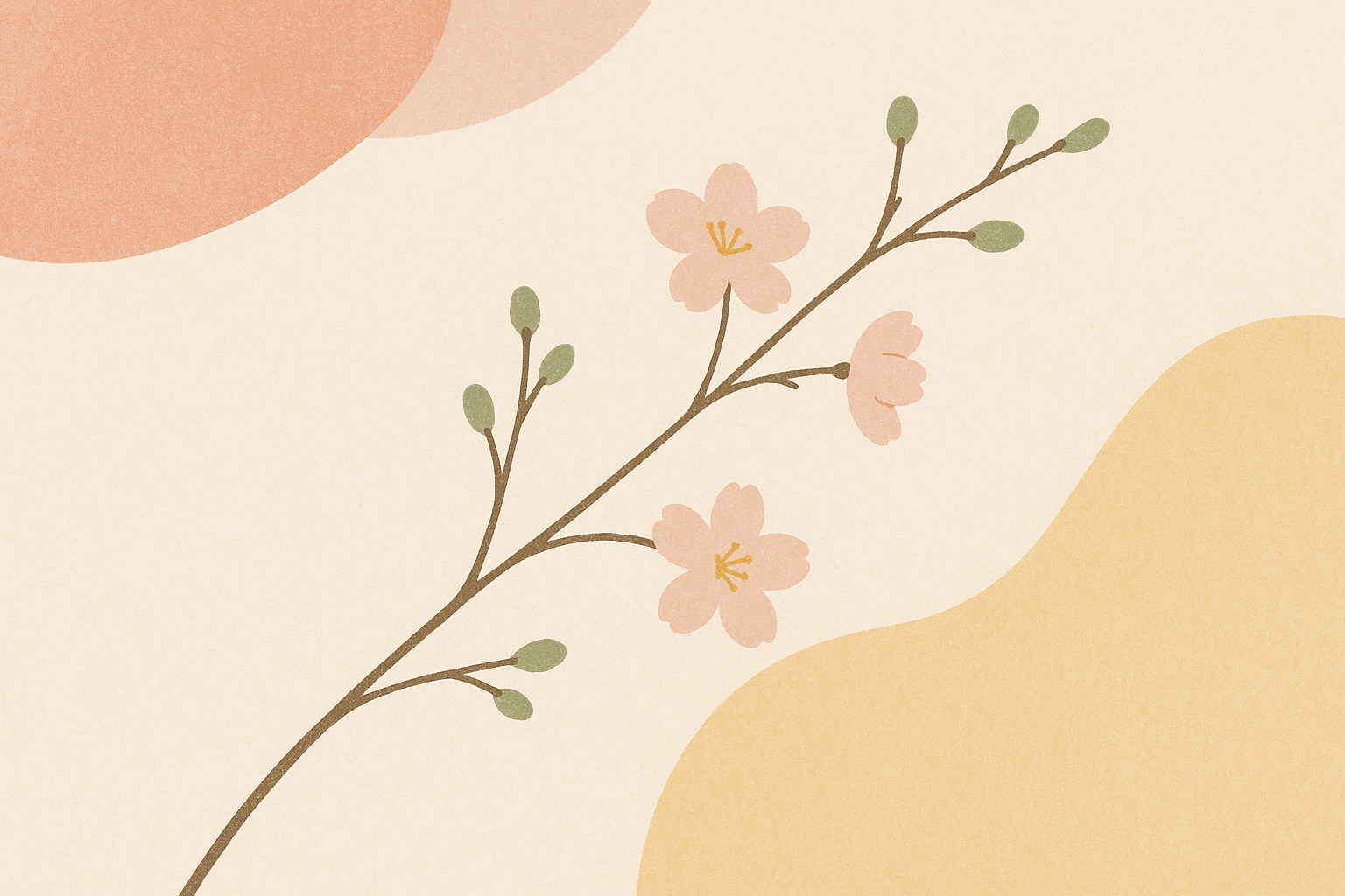 Illustration minimaliste sur fond beige clair avec des éléments plats en couleurs douces : livre ouvert, plante verte en pot orange, tasse avec bougie, cœur rouge, étoile jaune, notes de musique, formes abstraites vertes, violettes et oranges. Style épuré et chaleureux, palette pastel automnale, ambiance calme et créative.