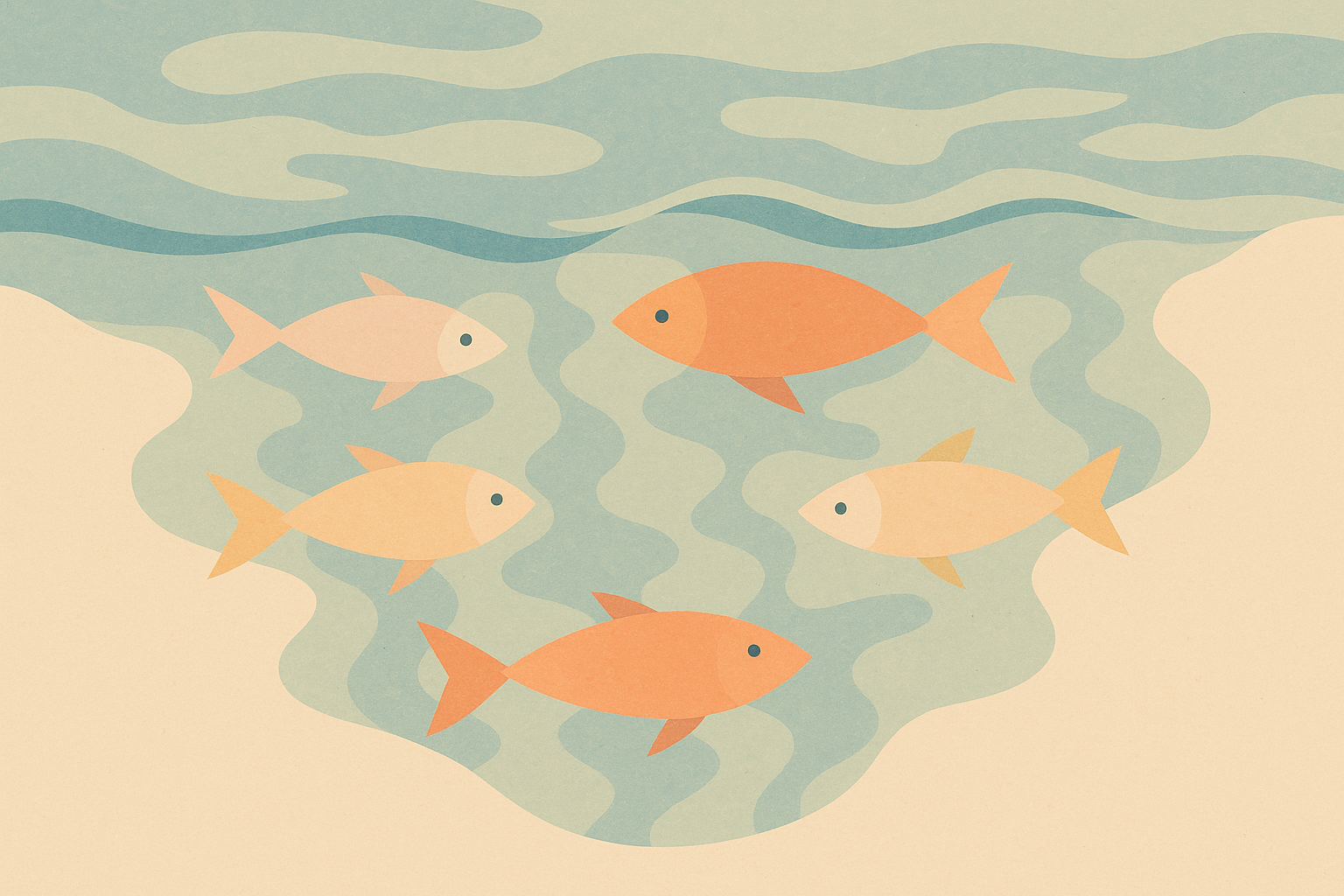 Illustration vectorielle douce avec des tons pastel chauds (orange, vert, bleu, beige) représentant une théière, un livre ouvert, une plante en pot, une tasse, une lampe, un crayon, un plaid géométrique et des éléments décoratifs abstraits. Style minimaliste et cosy, ambiance de bureau ou de maison chaleureuse, fond blanc épuré avec composition centrée en bas de l’image.
