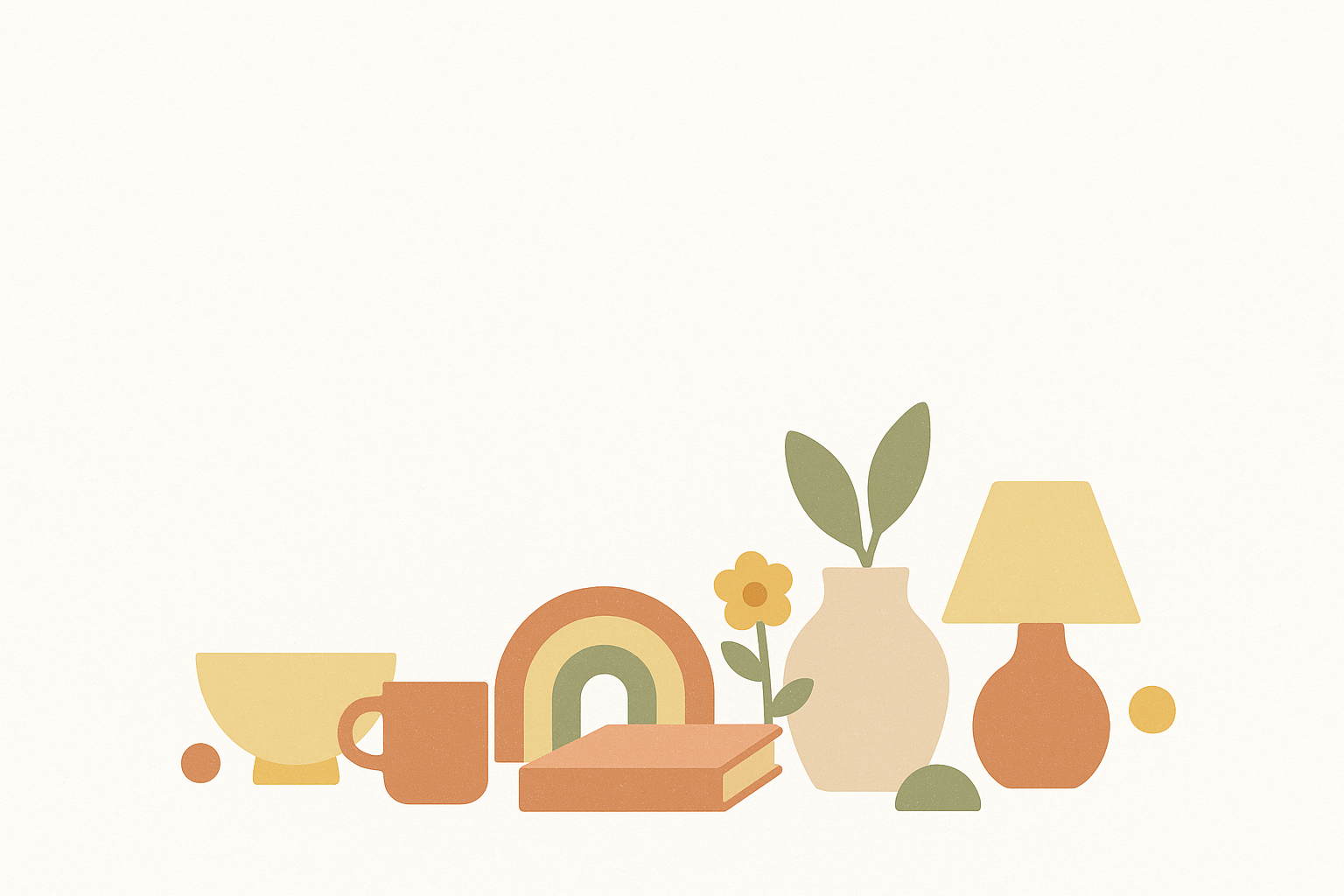 Illustration minimaliste en tons pastel avec des objets stylisés : tasse orange, bol jaune, livre, plante verte en pot beige, lampe de bureau orange et jaune, arc-en-ciel décoratif, fleur et formes géométriques. Palette de couleurs chaudes et naturelles (ocre, vert olive, beige, terracotta). Style rétro épuré avec fond blanc cassé, ambiance calme et professionnelle.