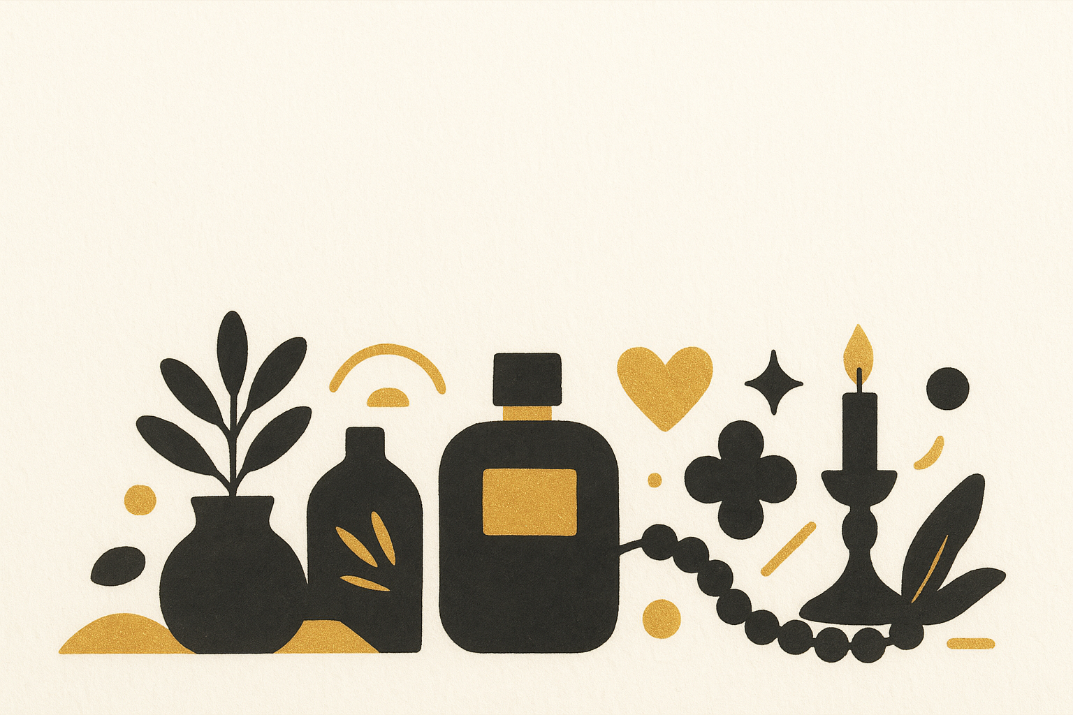 Illustration minimaliste en noir et or sur fond crème, représentant des objets décoratifs stylisés : flacons, bougie, vase avec feuillage, perles, cœur, trèfle, et formes abstraites. Le style est graphique, épuré, avec des formes pleines et des contrastes nets. L’ensemble évoque une ambiance élégante et contemporaine, idéale pour un usage professionnel.