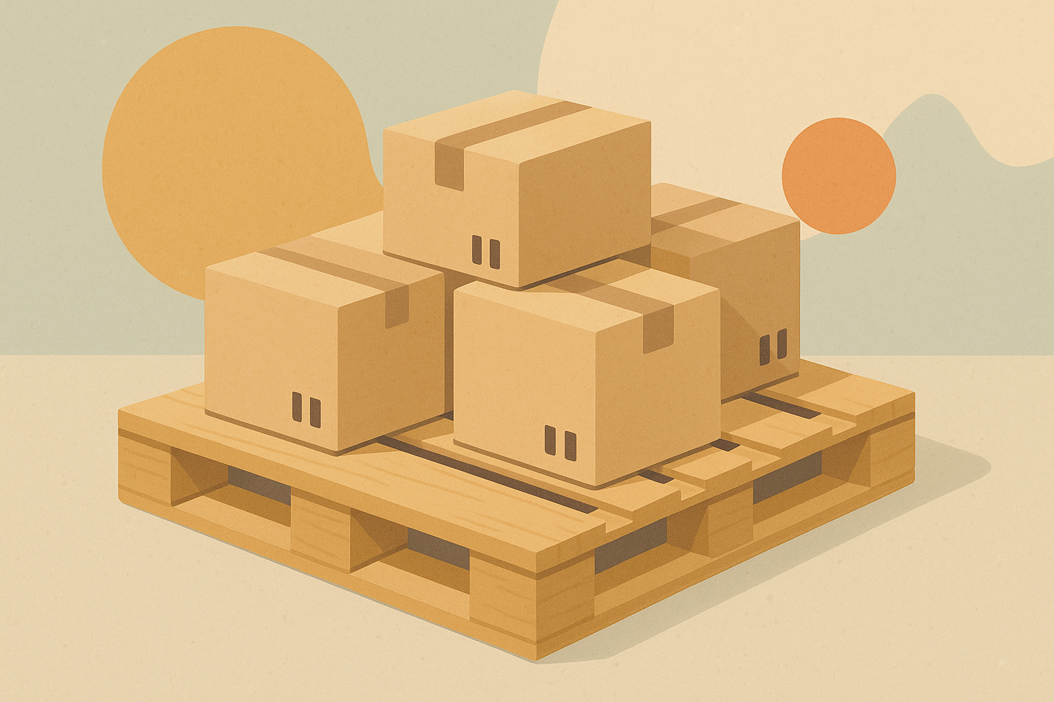 Illustration vectorielle en tons beige et brun clair représentant trois cartons empilés sur une palette en bois, avec des éléments graphiques abstraits comme des flèches, étoiles, formes géométriques et lignes ondulées. Style minimaliste et épuré, fond crème uni, ambiance douce et professionnelle adaptée aux thématiques de logistique, d’expédition ou de chaîne d’approvisionnement.