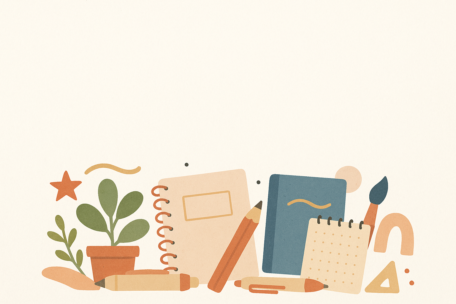 Illustration vectorielle avec carnets à spirale, crayons, stylo, plante en pot, pinceau, formes géométriques et éléments décoratifs. Palette de couleurs douces et naturelles : beige, terracotta, vert olive, bleu ardoise et jaune sable. Style minimaliste et épuré, ambiance créative et professionnelle, fond clair avec éléments disposés en bas de l’image laissant de l’espace pour le texte.