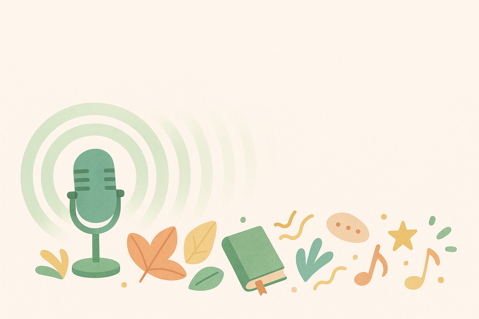 Illustration vectorielle douce avec un micro vert stylisé au centre gauche, entouré d’ondes sonores vert pâle. En bas, des éléments décoratifs en tons pastel : feuilles orange, jaune et vert, livre vert, notes de musique, étoile jaune, bulle de dialogue, formes abstraites. Palette de couleurs automnales douces sur fond beige clair, style plat et minimaliste, ambiance chaleureuse et créative.