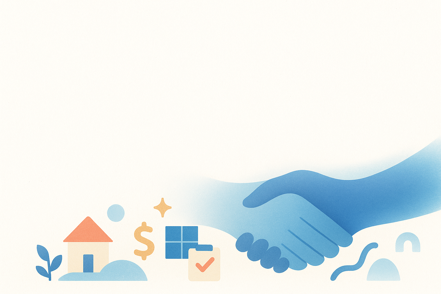 Illustration vectorielle avec une poignée de main bleue au centre droit, accompagnée d'icônes stylisées en bas à gauche : maison, symbole dollar, case cochée, fenêtre, étoile et éléments abstraits. Palette douce en bleu, orange et beige sur fond crème, style minimaliste et professionnel, parfait pour des visuels de communication B2B.