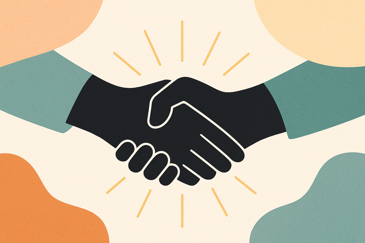 Illustration vectorielle sur fond beige clair avec une grande poignée de main noire au centre, entourée de rayons symbolisant l'impact ou la réussite. En bas, des éléments colorés en tons pastel (orange, vert, jaune, saumon) représentant des icônes de croissance, de communication, d'idées et de nature : graphique en barres, ampoule, bulle de dialogue, crayon, plantes en pot, engrenage. Style épuré et professionnel, ambiance chaleureuse et collaborative.