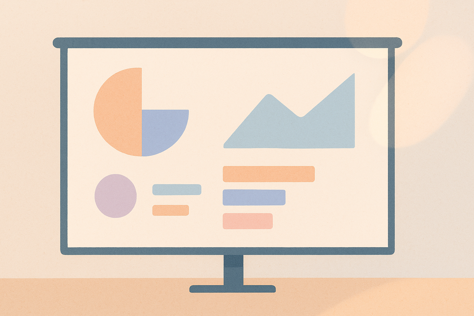 Illustration abstraite avec un tableau de présentation violet contenant des graphiques stylisés, courbes, barres et symboles, entouré de formes géométriques simples (cercle, triangle, engrenage, vague) dans des tons pastel doux (rose, jaune, bleu, beige). Style minimaliste et professionnel, parfait pour visuels de communication d'entreprise ou cartes postales corporatives.