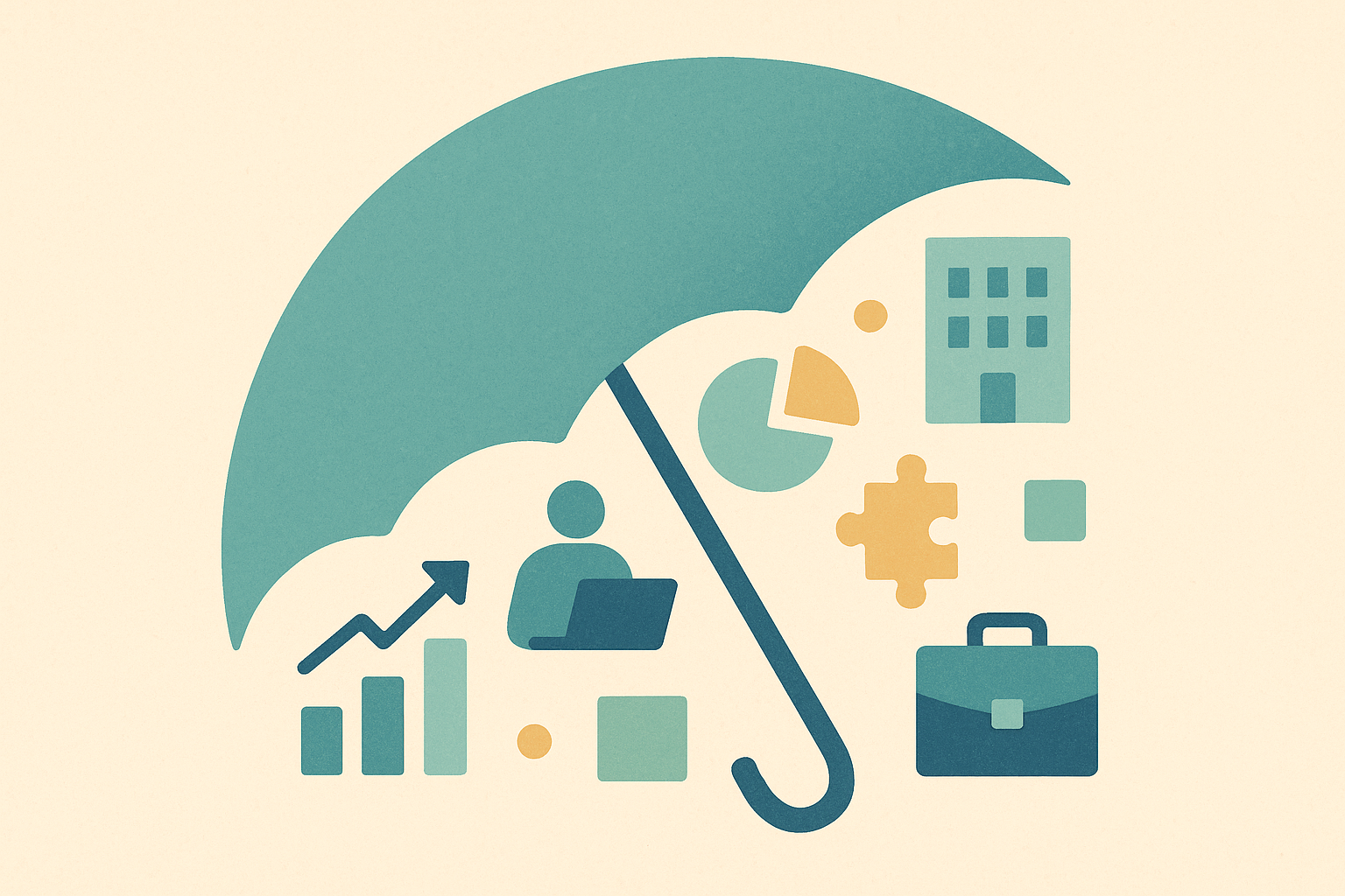 Illustration vectorielle minimaliste avec une palette pastel bleu-vert et beige. Un grand parapluie vert-bleu couvre des icônes d'affaires : graphique en hausse, mallette, graphique circulaire, enveloppe, engrenage, bureau avec ordinateur et plante. Style plat, formes douces et arrondies, ambiance professionnelle et rassurante.