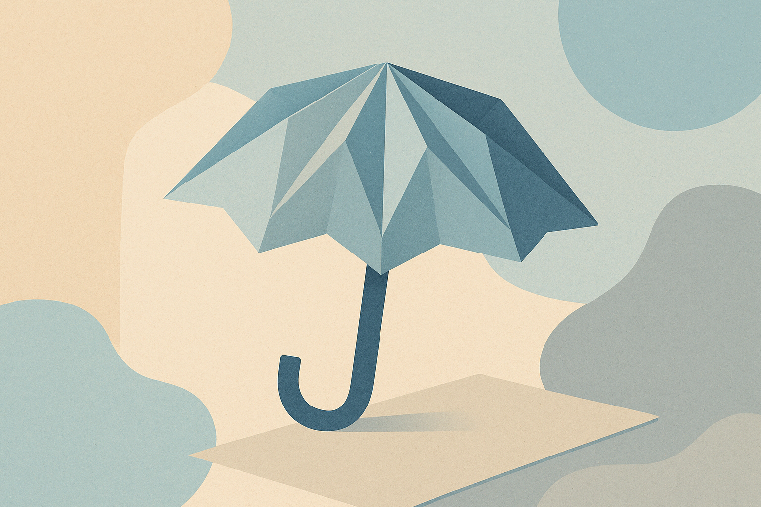 Illustration vectorielle minimaliste avec un parapluie bleu-gris au centre, entouré d'une tasse orange, d'un fauteuil bleu, d'une horloge, d'un clipboard avec icône de bouclier, et de feuilles abstraites. Palette douce en tons pastel de bleu, orange, beige et gris sur fond crème. Style épuré et professionnel, parfait pour des visuels de communication d'entreprise ou assurances.