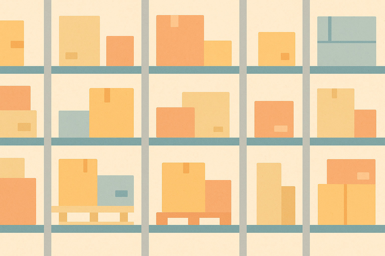 Illustration vectorielle minimaliste de rayonnages métalliques bleus contenant des boîtes rectangulaires de différentes tailles en tons pastel bleu, gris et beige. Fond crème clair avec une composition symétrique et aérée, évoquant l'organisation, la logistique et l'entreposage. Style épuré, industriel et professionnel, parfait pour visuels d'entreprise ou cartes postales B2B.