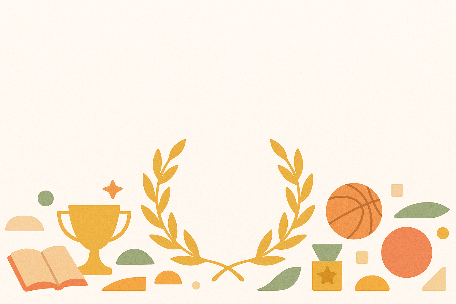 Design vectoriel aux tons doux et pastel avec des éléments symbolisant la réussite : trophée doré, couronnes de laurier, médaille, livre ouvert, ballon de basket et formes géométriques décoratives en orange, vert, jaune et beige. Fond crème clair, style épuré et moderne avec une composition centrée en bas de l’image, laissant un grand espace vide pour le texte.