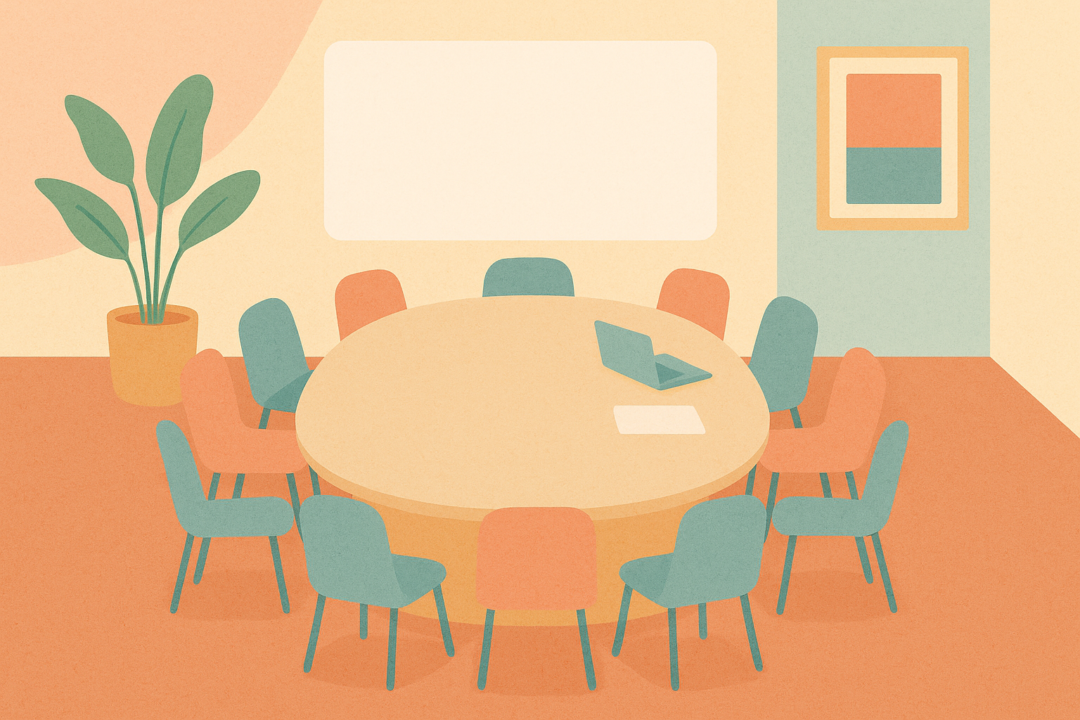 Illustration minimaliste aux tons pastel avec une table de réunion beige, trois chaises stylisées en bleu et orange, une horloge, des graphiques en barres, des documents, des icônes de validation, des formes géométriques et des éléments de bureau. Palette douce avec beige, bleu-gris, vert sauge, pêche et terracotta. Style épuré, professionnel et contemporain, parfait pour un contexte d'affaires.