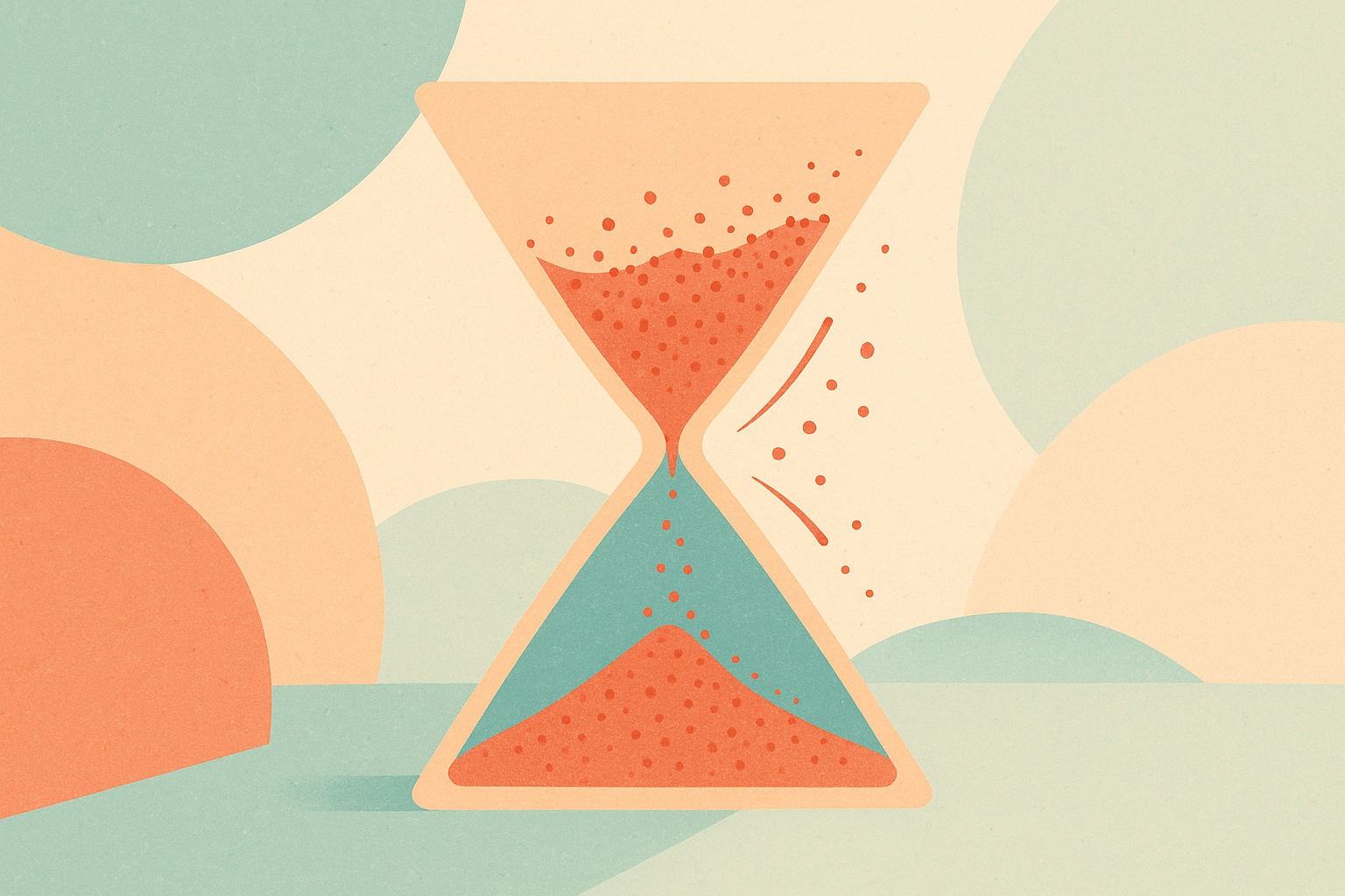Illustration minimaliste avec un sablier central vert et saumon, entouré de formes géométriques simples comme des arcs, triangles et demi-cercles en tons pastel (vert foncé, corail, beige). Fond crème uni, composition équilibrée avec des points dispersés à droite pour suggérer le mouvement ou le passage du temps. Style abstrait, moderne et épuré, parfait pour un usage professionnel.