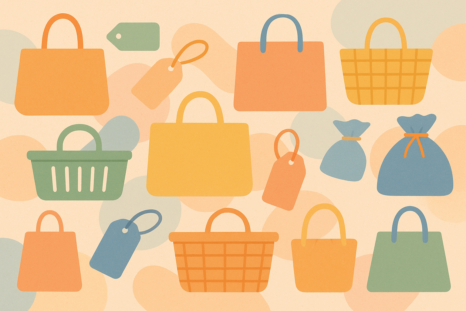 Illustration vectorielle minimaliste de sacs de shopping, paniers et étiquettes en tons pastel doux (ocre, saumon, beige, turquoise). Fond crème uni, composition linéaire en bas de l’image avec des formes géométriques simples et des contours arrondis. Style épuré et chaleureux, parfait pour des visuels liés au commerce, à la vente ou à la communication d'entreprise.
