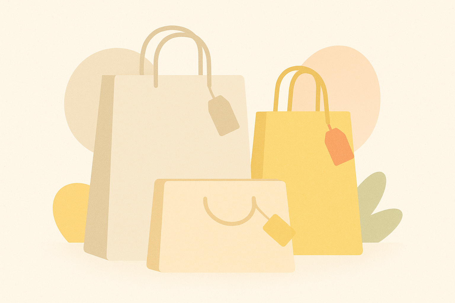 Illustration vectorielle minimaliste avec sacs de shopping beiges et roses, étiquettes de prix et pastille circulaire sur fond crème texturé. Palette douce en tons pastel (beige, pêche, rose clair), formes géométriques simples et style épuré. Idéal pour visuels liés au commerce, branding ou marketing visuel.