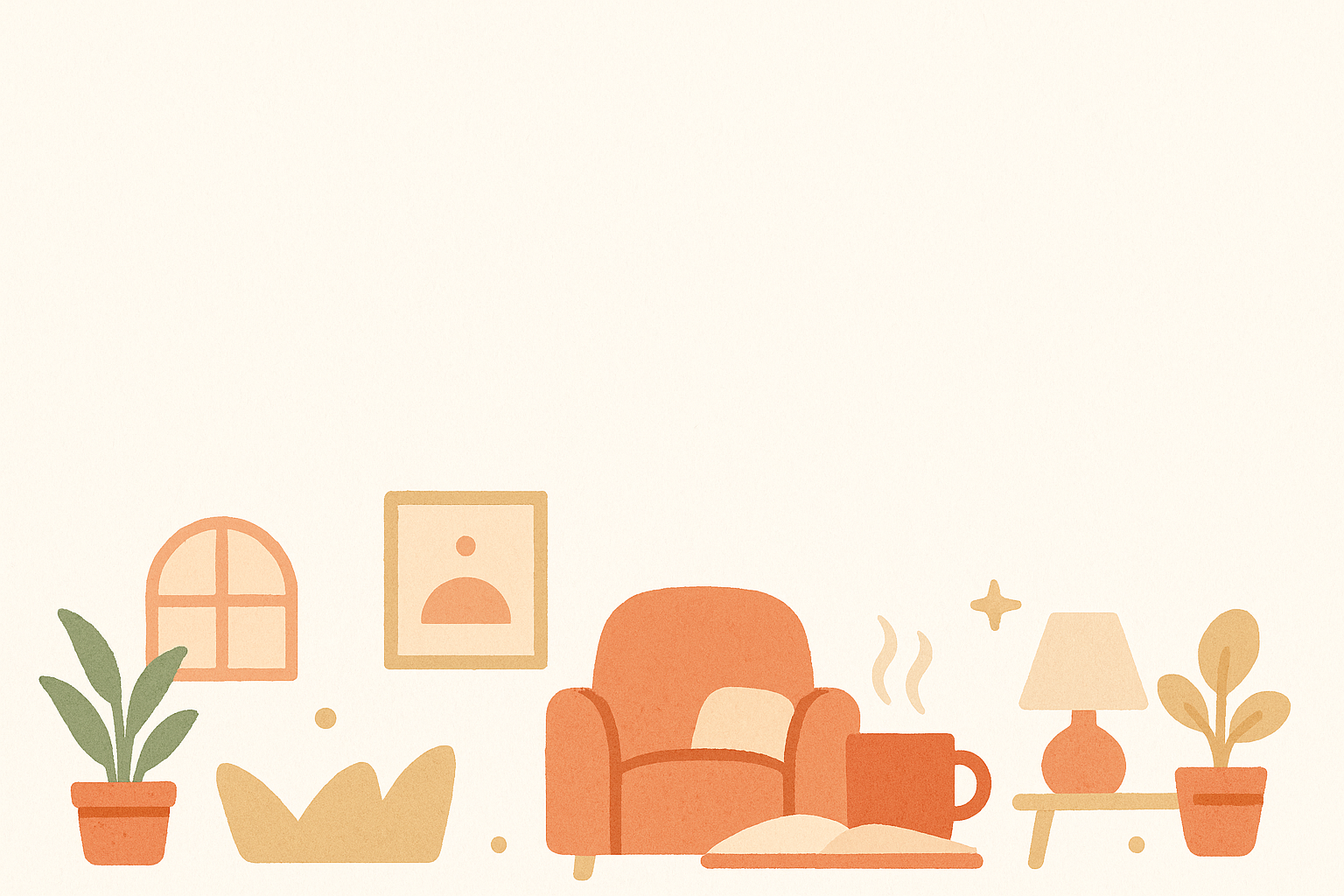 Illustration vectorielle minimaliste d’un salon cosy avec fauteuil orange, coussins, tasse fumante, lampe de table, plantes en pot, tableau mural et fenêtre arrondie. Palette de couleurs douces dans les tons beige, terracotta, ocre et vert olive, avec un style épuré et chaleureux. Fond clair avec espace vide en haut pour insertion de texte ou logo.