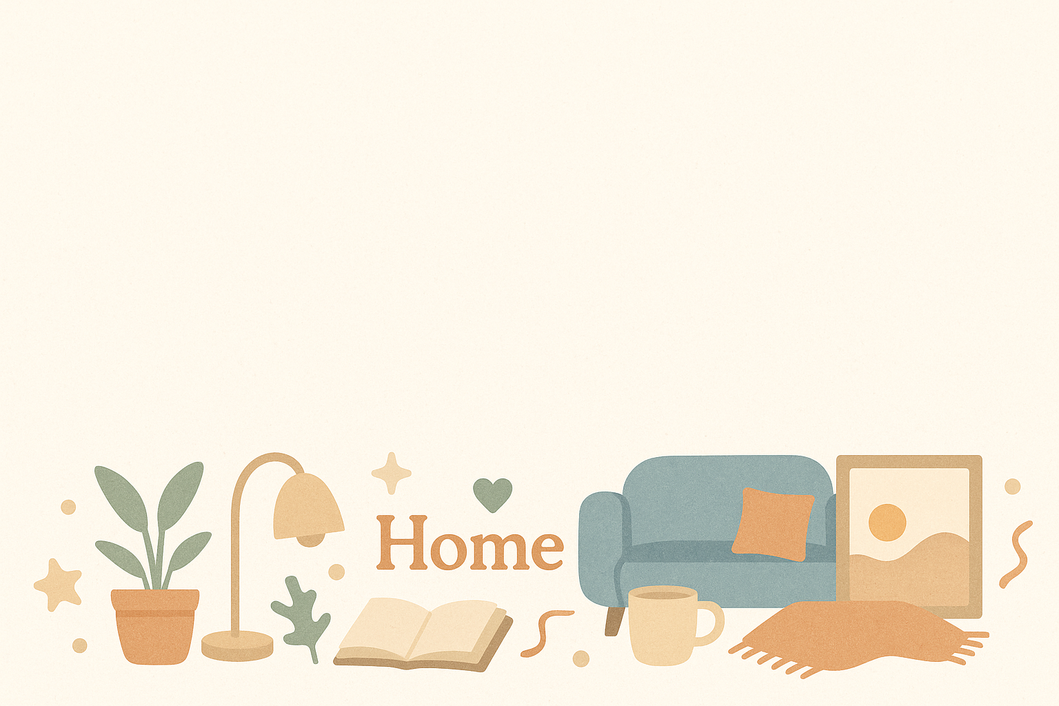 Illustration vectorielle douce avec canapé bleu, coussin ocre, lampe de lecture, plante verte en pot, livre ouvert, tasse beige, cadre avec coucher de soleil, et tapis orange. Palette de couleurs pastel naturelles : beige, vert olive, bleu doux, ocre et sable. Style minimaliste et chaleureux, ambiance intérieure cosy avec éléments de décoration domestique.