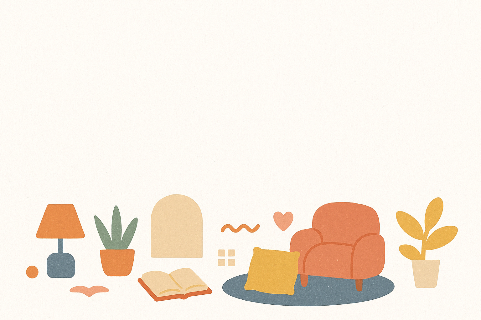 Illustration vectorielle minimaliste d’un salon cosy avec fauteuil orange, lampe de table, coussin jaune, plantes en pot, livre ouvert et tapis bleu sur fond crème. Palette de couleurs douces et terreuses : orange brûlé, jaune moutarde, beige, vert olive et bleu ardoise. Style épuré, formes arrondies et ambiance chaleureuse idéale pour design de carte postale professionnelle.