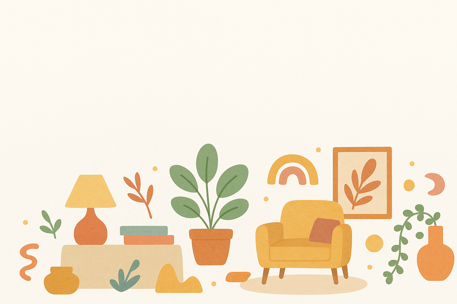 Illustration vectorielle d’un intérieur de salon avec fauteuil jaune moutarde, plantes vertes en pot, lampe orange, tableaux décoratifs, livres et éléments abstraits. Palette de couleurs douces et naturelles : beige, vert olive, terracotta, jaune ocre. Style minimaliste et chaleureux, ambiance cosy et professionnelle, fond clair avec espace vide en haut pour texte ou logo.