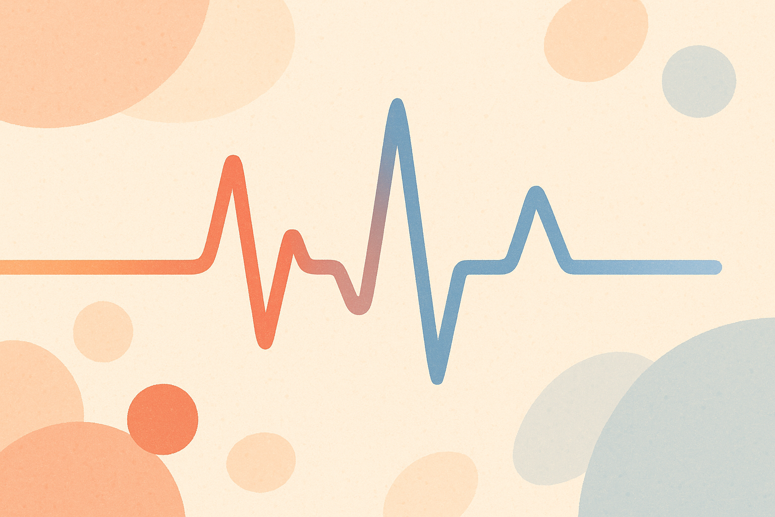 Illustration vectorielle avec ligne de fréquence cardiaque rouge et bleue au centre, sur fond beige clair. En bas, des icônes colorées représentant un cœur rouge, des pilules, une montre connectée orange, une bouteille de médicament, une croix médicale jaune, une plante verte en pot et des éléments graphiques géométriques. Palette de couleurs pastel chaudes et froides, style plat et minimaliste, ambiance santé, technologie et bien-être.
