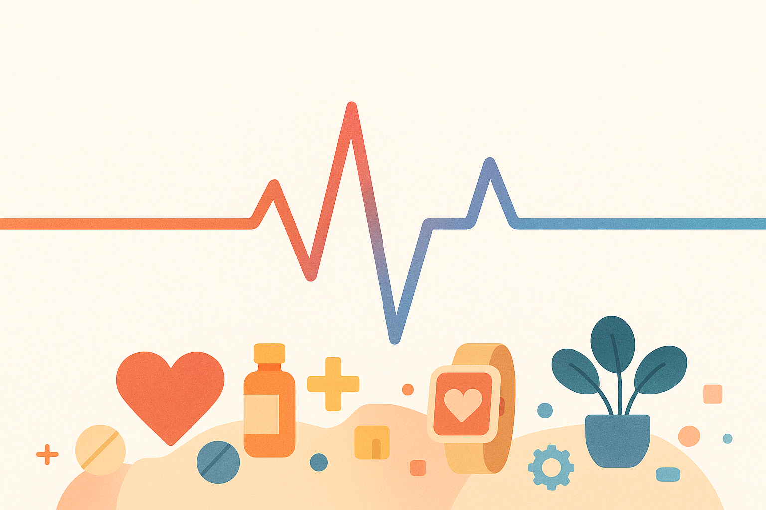 Illustration vectorielle avec ligne de fréquence cardiaque rouge et bleue au centre, sur fond beige clair. En bas, des icônes colorées représentant un cœur rouge, des pilules, une montre connectée orange, une bouteille de médicament, une croix médicale jaune, une plante verte en pot et des éléments graphiques géométriques. Palette de couleurs pastel chaudes et froides, style plat et minimaliste, ambiance santé, technologie et bien-être.