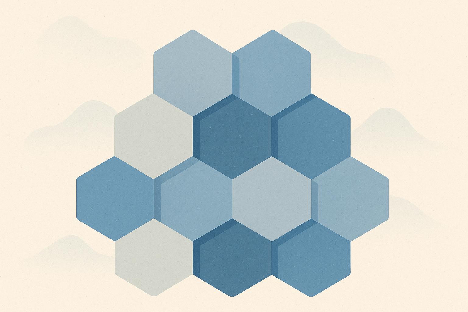 Illustration minimaliste avec un bouclier bleu au centre, un cadenas jaune, une maison beige, une épingle de localisation bleue, des nuages stylisés, une plume et des éléments décoratifs abstraits. Palette de couleurs douces en tons pastel : bleu, beige, jaune moutarde et orange clair. Style plat et épuré, fond blanc cassé, composition équilibrée et professionnelle.