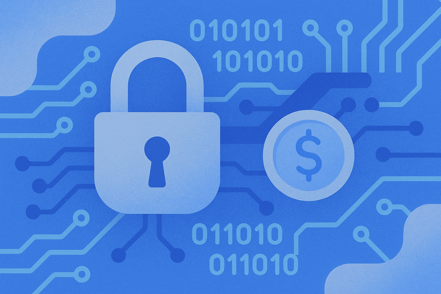 Illustration vectorielle en tons bleus et gris sur fond crème, représentant un cadenas, des circuits imprimés, des chiffres binaires, un symbole dollar et des icônes abstraites. Style épuré et technologique, avec des lignes connectées rappelant un schéma électronique. Idéal pour des thèmes de cybersécurité, finance digitale, technologie ou communication d'entreprise.