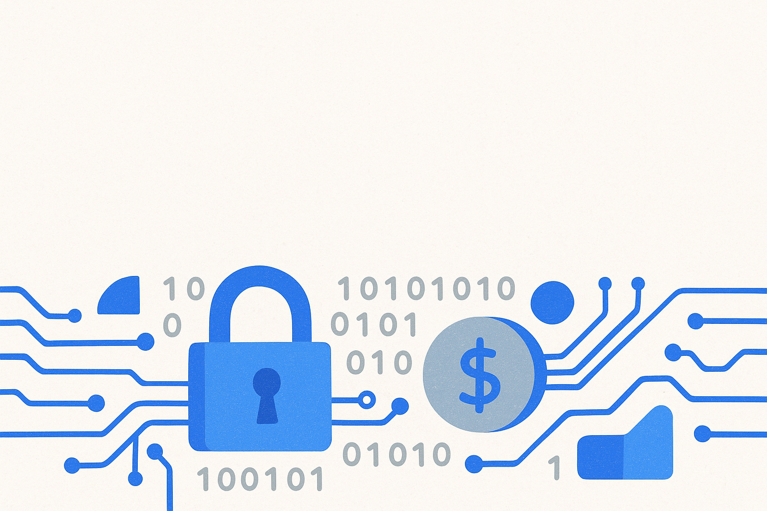 Illustration vectorielle en tons bleus et gris sur fond crème, représentant un cadenas, des circuits imprimés, des chiffres binaires, un symbole dollar et des icônes abstraites. Style épuré et technologique, avec des lignes connectées rappelant un schéma électronique. Idéal pour des thèmes de cybersécurité, finance digitale, technologie ou communication d'entreprise.