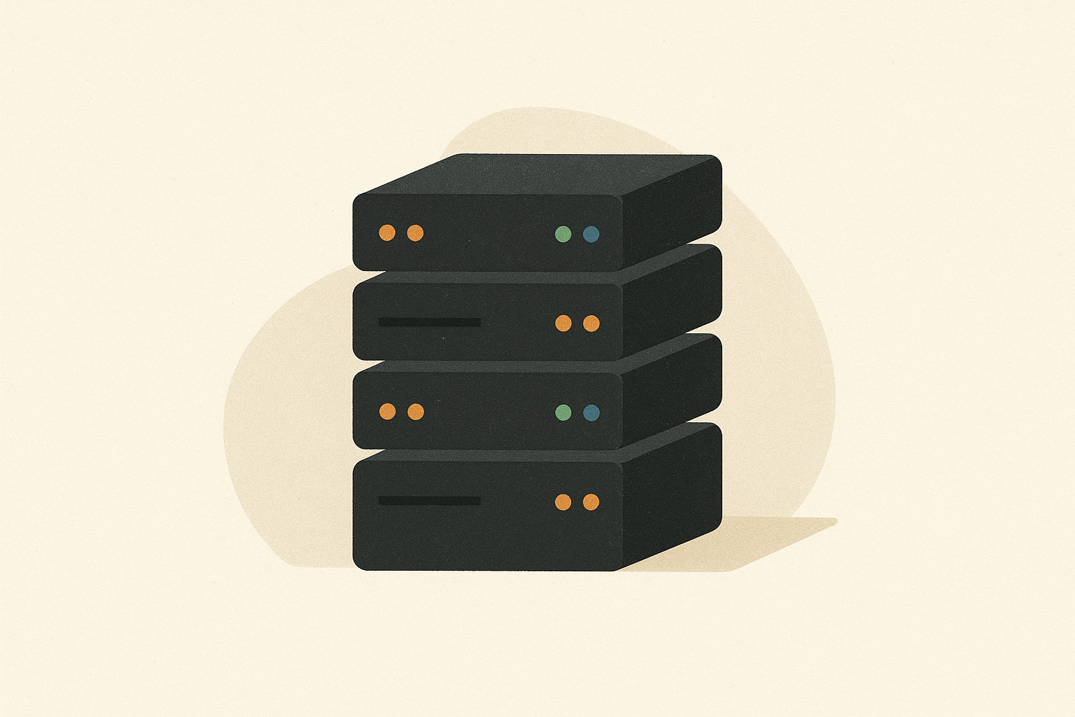 Illustration vectorielle de serveurs noirs empilés avec voyants colorés (orange, vert, bleu) sur fond jaune dégradé. Style minimaliste et technologique, ambiance professionnelle et futuriste. Éléments géométriques simples, composition centrée avec effet de lumière douce sur certains modules.