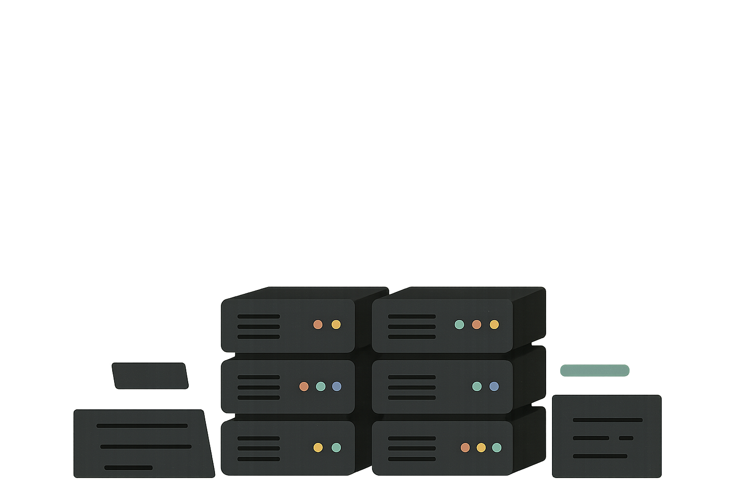 Illustration vectorielle de serveurs noirs empilés avec voyants colorés (orange, vert, bleu) sur fond jaune dégradé. Style minimaliste et technologique, ambiance professionnelle et futuriste. Éléments géométriques simples, composition centrée avec effet de lumière douce sur certains modules.