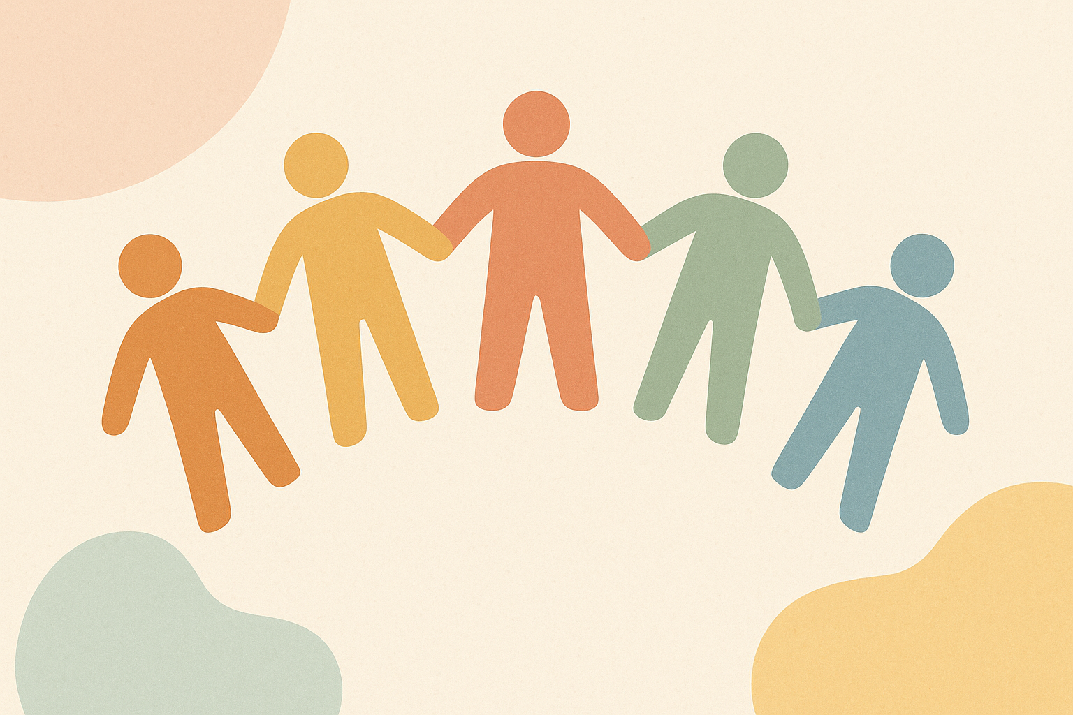 Illustration minimaliste sur fond crème avec six silhouettes humaines stylisées en papier découpé, aux couleurs douces pastel : orange, bleu, jaune, rouge et vert. Les personnages se tiennent la main, formant une chaîne symbolique d’unité et de diversité. Le style est épuré, chaleureux et convivial, avec un grand espace vide en haut pour l’ajout de texte ou de message personnalisé.