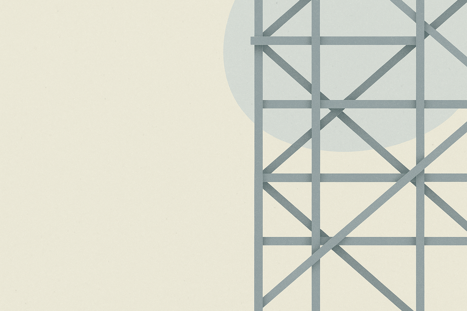 Illustration minimaliste de structures métalliques géométriques en gris clair sur fond crème uni. Les formes sont composées de lignes croisées et de cadres rectangulaires, évoquant des échafaudages ou des charpentes industrielles. Style épuré, technique et contemporain, avec une palette neutre et professionnelle.