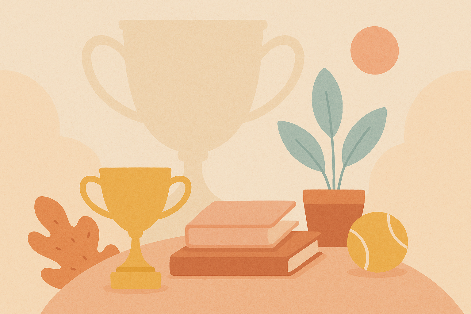 Illustration vectorielle aux tons pastel doux (beige, orange, bleu, rose) représentant un trophée central, une étoile, des graphiques de croissance, une coche dans un carré bleu, une flèche montante rouge et des éléments abstraits. Style épuré et moderne, parfait pour des thèmes de réussite, performance, accomplissement et communication professionnelle.