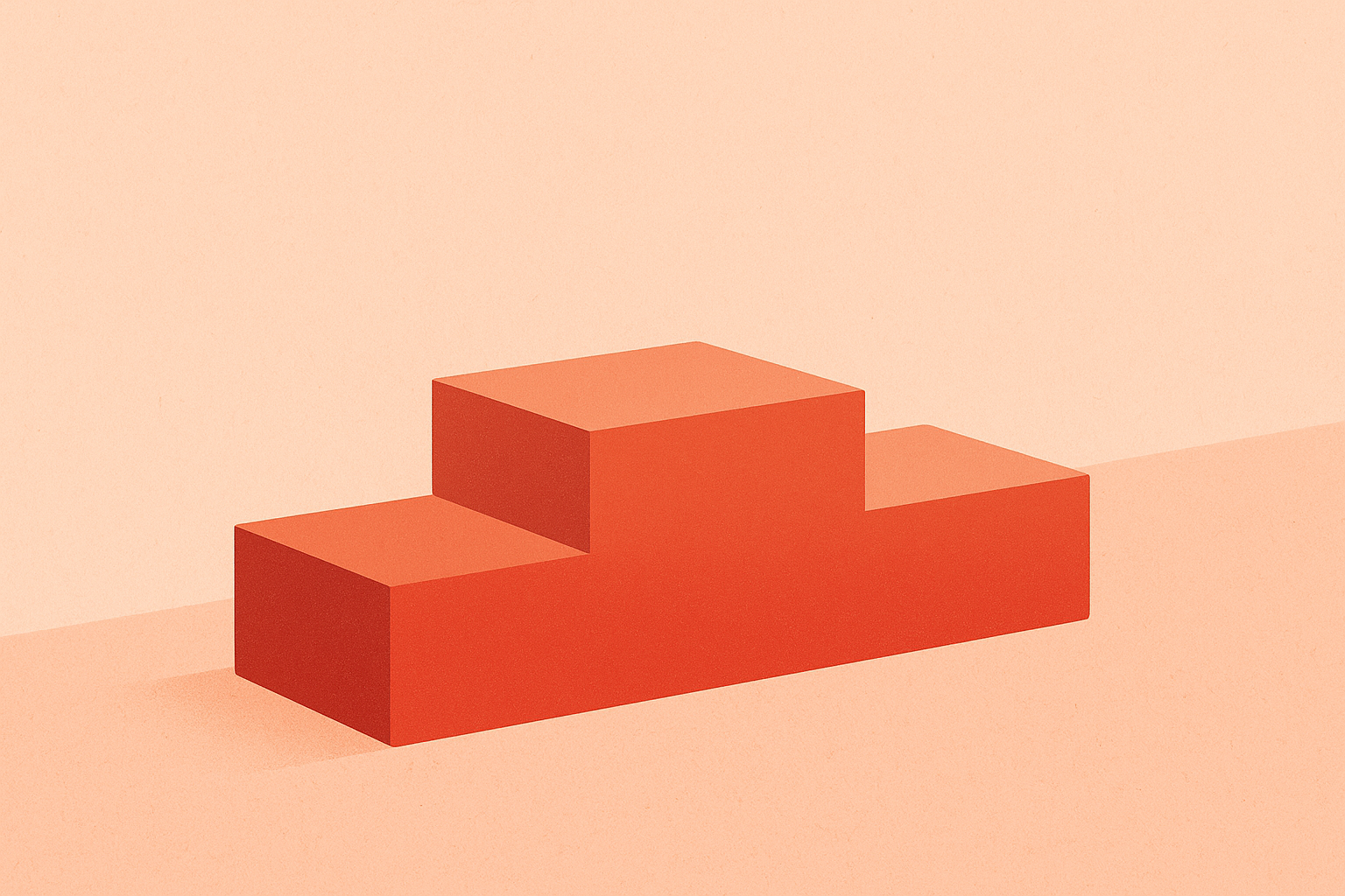 Illustration minimaliste aux tons chauds beige, orange et saumon, représentant un trophée doré sur un podium rouge, une cible avec flèche, une étoile, une fleur stylisée et divers symboles abstraits. Style plat et épuré, ambiance professionnelle et motivante, parfaite pour visuels de communication d'entreprise ou cartes postales de félicitations.