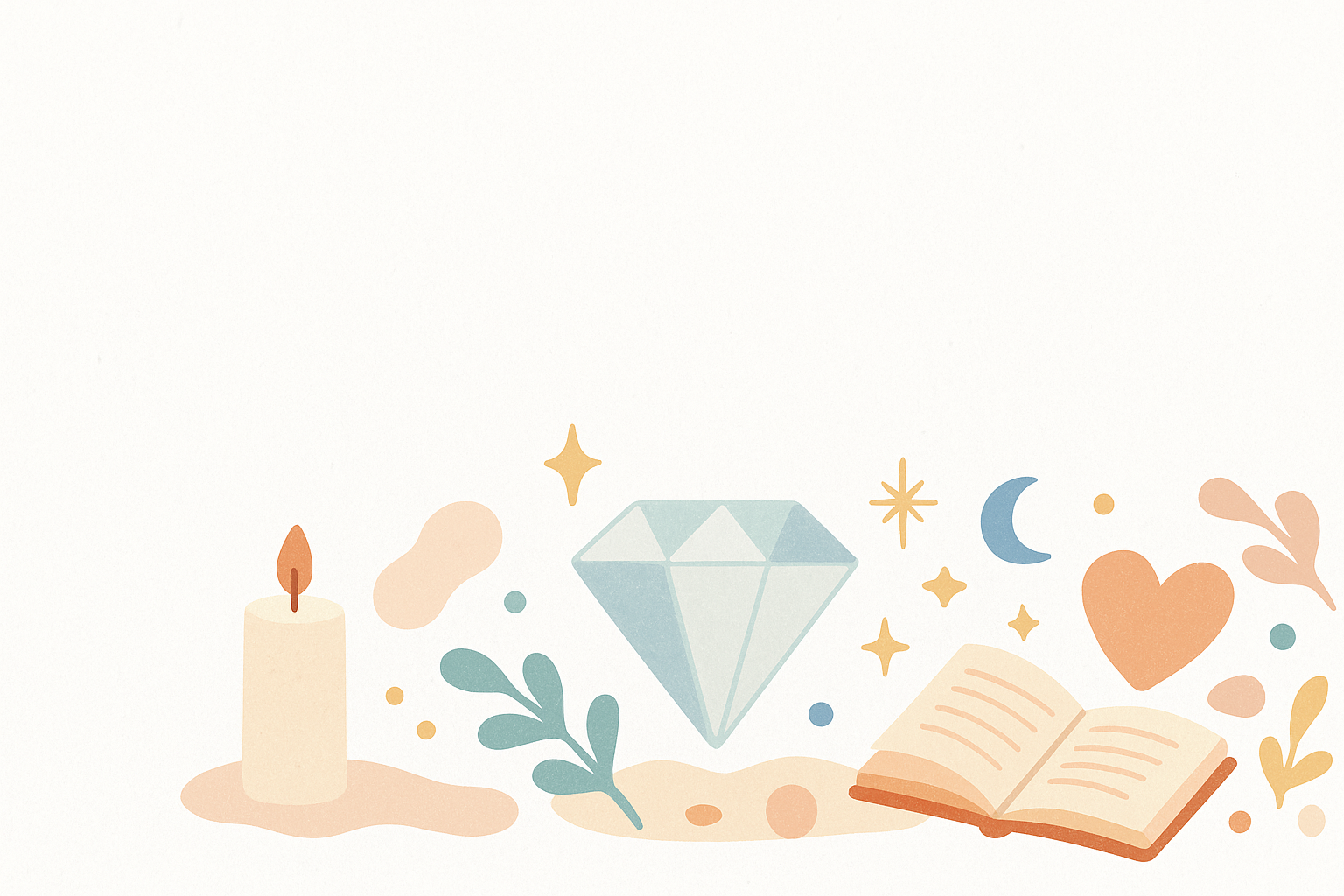 Illustration minimaliste aux couleurs pastel douces (beige, bleu clair, orange, vert sauge) représentant une bougie, un diamant, un livre ouvert, un cœur, des étoiles, une lune et des éléments végétaux abstraits. Style épuré et chaleureux avec des formes organiques et symboliques sur fond blanc cassé, parfait pour des cartes postales professionnelles au ton inspirant et raffiné.