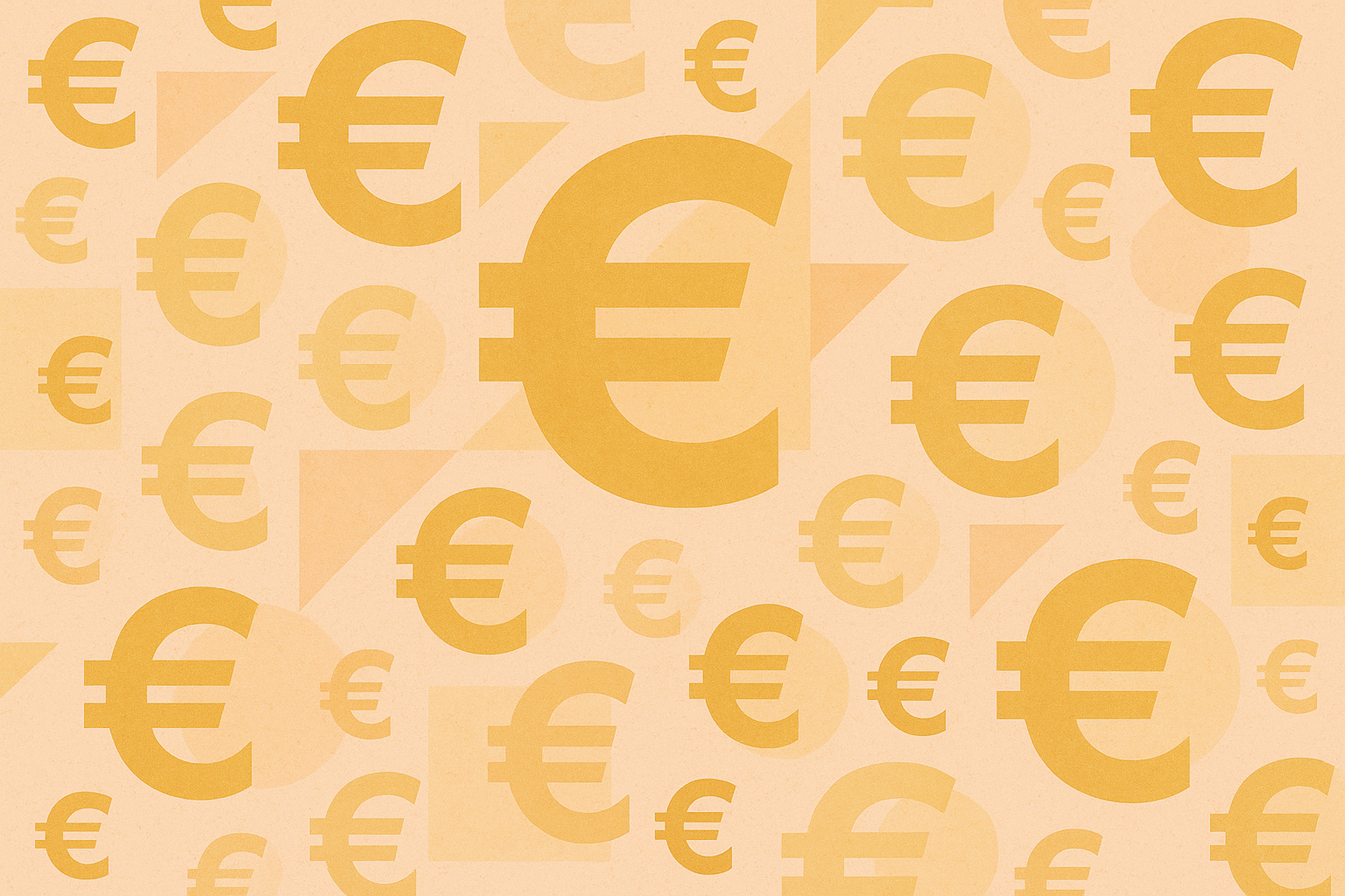 Motif répétitif de symboles euro (€) en dégradé doré, répartis en bas de l'image sur fond blanc crème. Les symboles varient en taille et en opacité, créant un effet dynamique et structuré. Style épuré, professionnel, avec une palette de couleurs or métallisé et blanc, parfait pour thèmes financiers, économiques ou corporatifs.
