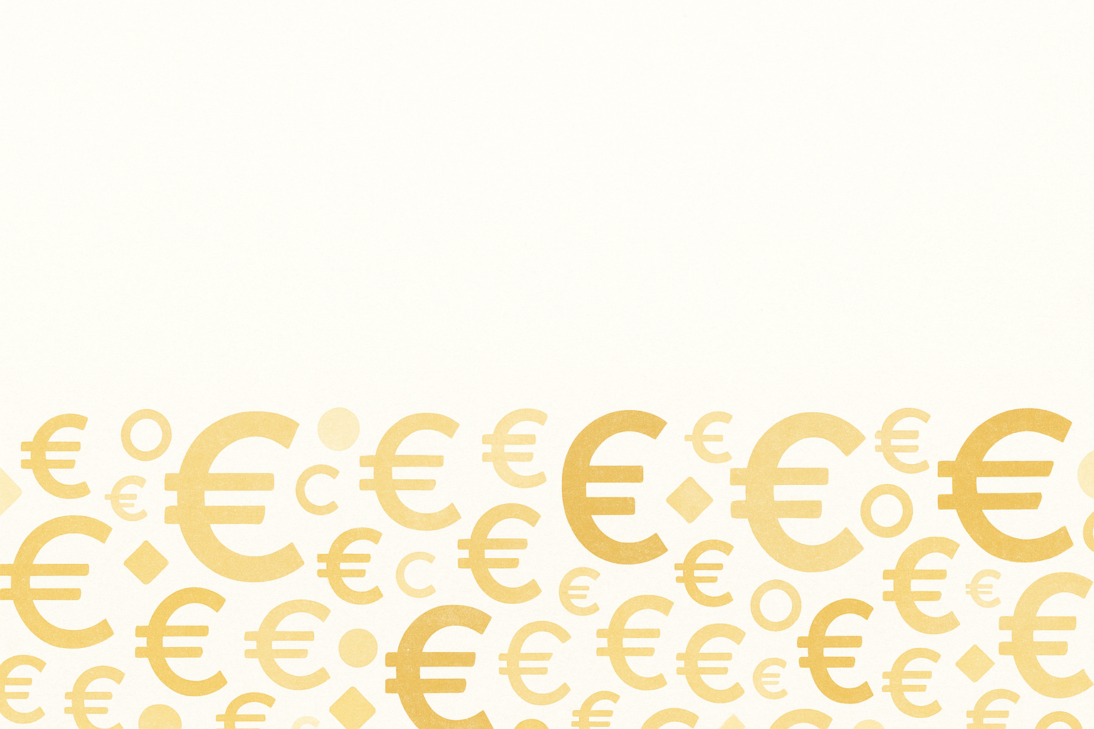 Motif répétitif de symboles euro (€) en dégradé doré, répartis en bas de l'image sur fond blanc crème. Les symboles varient en taille et en opacité, créant un effet dynamique et structuré. Style épuré, professionnel, avec une palette de couleurs or métallisé et blanc, parfait pour thèmes financiers, économiques ou corporatifs.