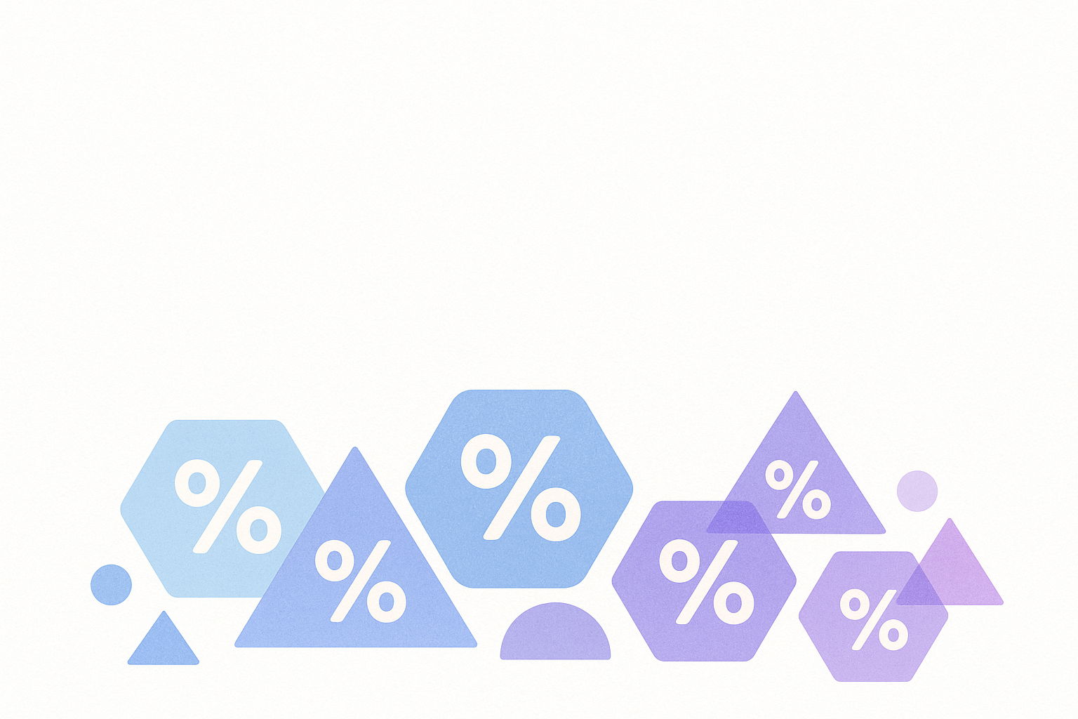 Motif géométrique composé de formes variées (hexagones, triangles, cercles, demi-cercles) en dégradés de bleu et violet pastel, avec des symboles de pourcentage blancs au centre de chaque forme. Le design est minimaliste, avec un fond blanc texturé et une disposition horizontale des éléments en bas de l’image. Style épuré, professionnel et contemporain, parfait pour un usage B2B ou institutionnel.