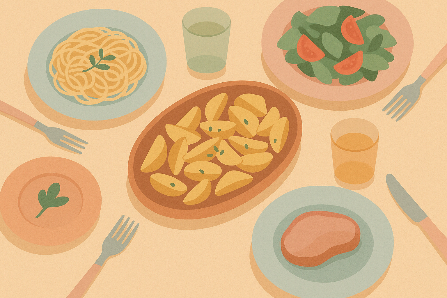 Illustration minimaliste en tons pastel doux (beige, orange, vert olive, bleu clair) représentant une table dressée avec assiettes, verres, couverts, pain, œufs, et plat principal stylisé. Les formes sont simples et arrondies, avec un fond crème uni et une composition centrée sur la partie inférieure de l’image, laissant un grand espace vide en haut pour le texte ou le message.