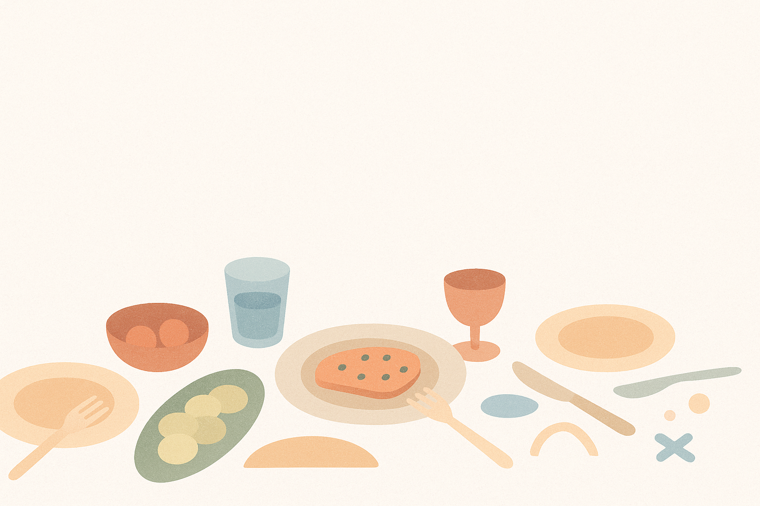 Illustration minimaliste en tons pastel doux (beige, orange, vert olive, bleu clair) représentant une table dressée avec assiettes, verres, couverts, pain, œufs, et plat principal stylisé. Les formes sont simples et arrondies, avec un fond crème uni et une composition centrée sur la partie inférieure de l’image, laissant un grand espace vide en haut pour le texte ou le message.