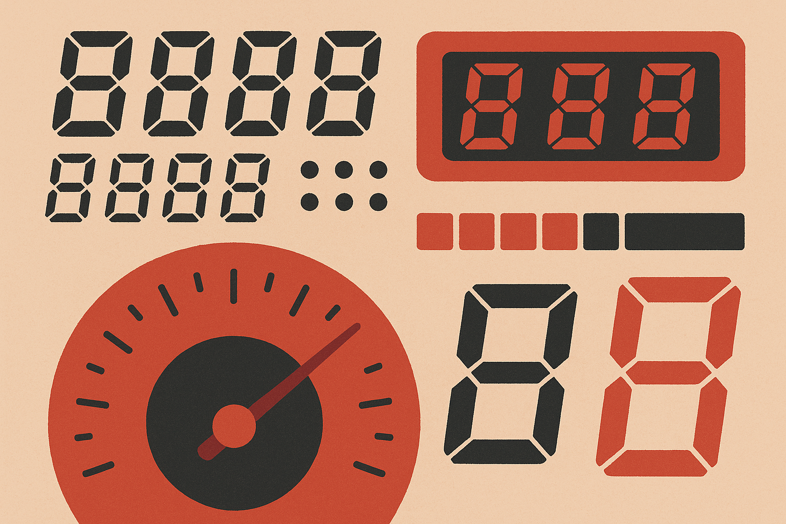 Fond crème avec icônes stylisées en rouge et noir représentant des compteurs, jauges, chiffres numériques et graphiques de performance. Style vectoriel épuré, formes géométriques (carrés, losanges, cercles) et lignes dynamiques évoquant la technologie, la vitesse et la précision. Ambiance moderne et professionnelle, parfaite pour des visuels d'affaires.